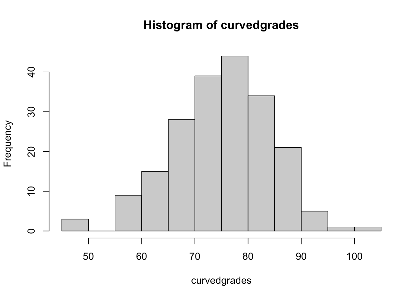 ## [197] 89.42669 48.26760 90.15344 83.56841sd(curvedgrades)## [1] 9.218072min(curvedgrades)## [1] 47.0478max(curvedgrades)## [1] 100.0336mean(curvedgrades)## [1] 75.17006hist(curvedgrades)