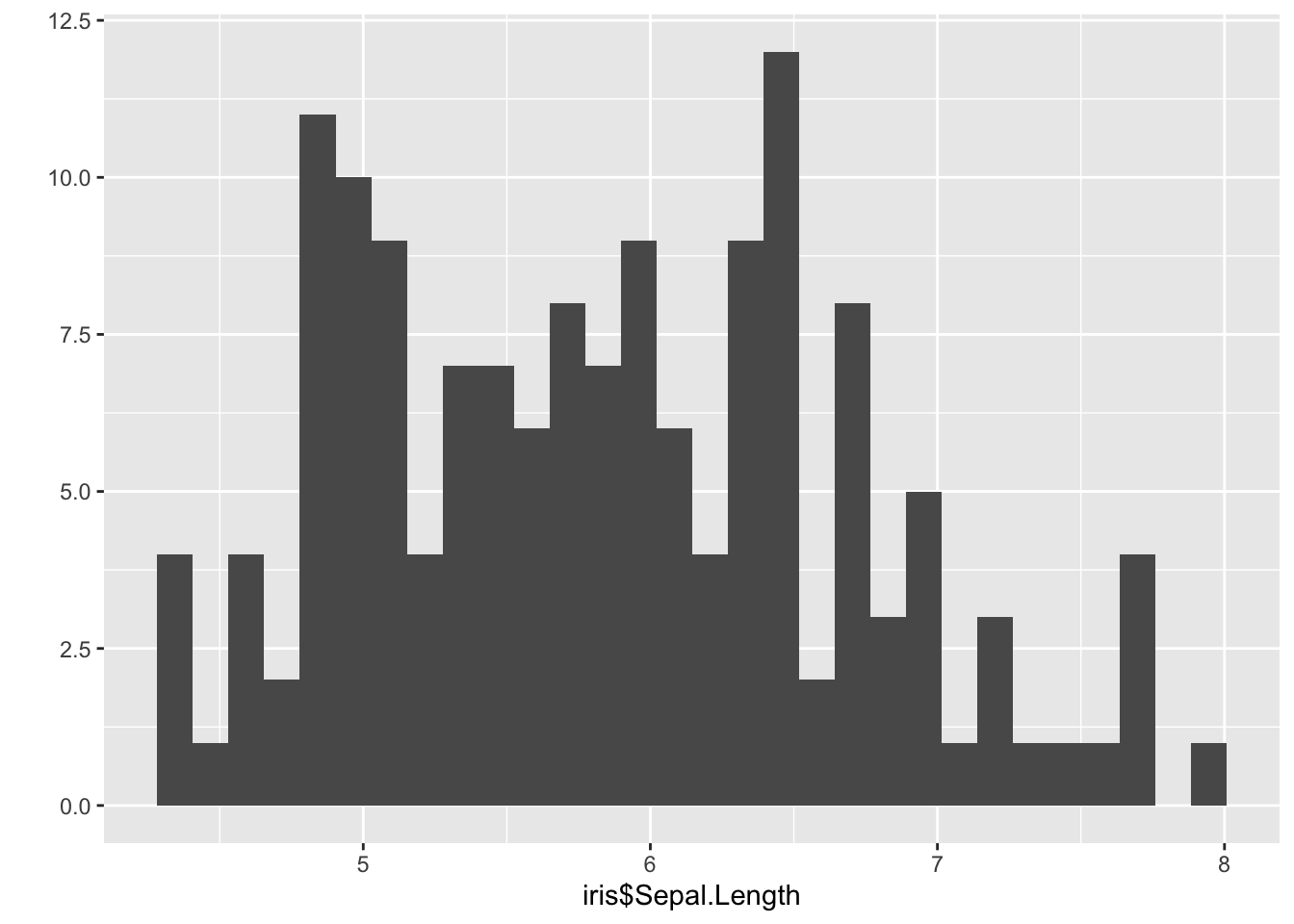 qplot(iris$Sepal.Length) ## Warning: `qplot()` was deprecated in ggplot2 3.4.0.