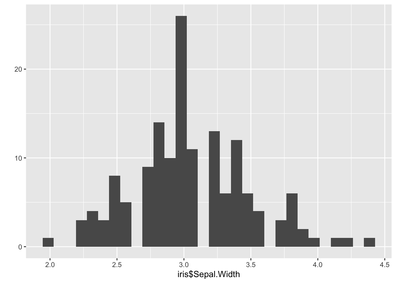 qplot(iris$Sepal.Width) ## `stat_bin()` using `bins = 30`. Pick better value with `binwidth`.