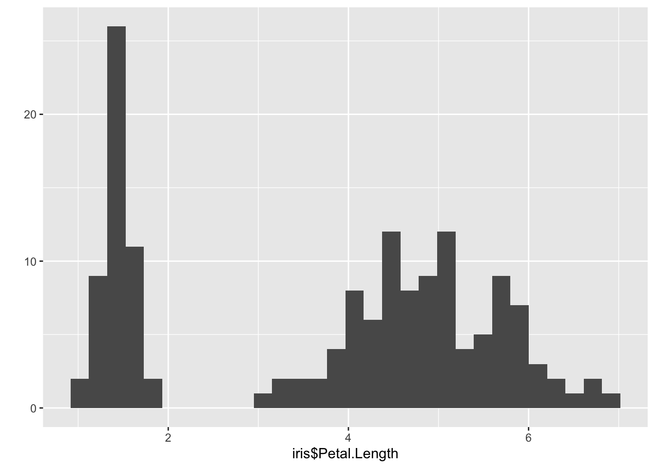 qplot(iris$Petal.Length) ## `stat_bin()` using `bins = 30`. Pick better value with `binwidth`.