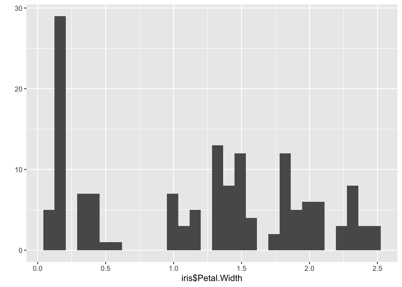 qplot(iris$Petal.Width) ## `stat_bin()` using `bins = 30`. Pick better value with `binwidth`.