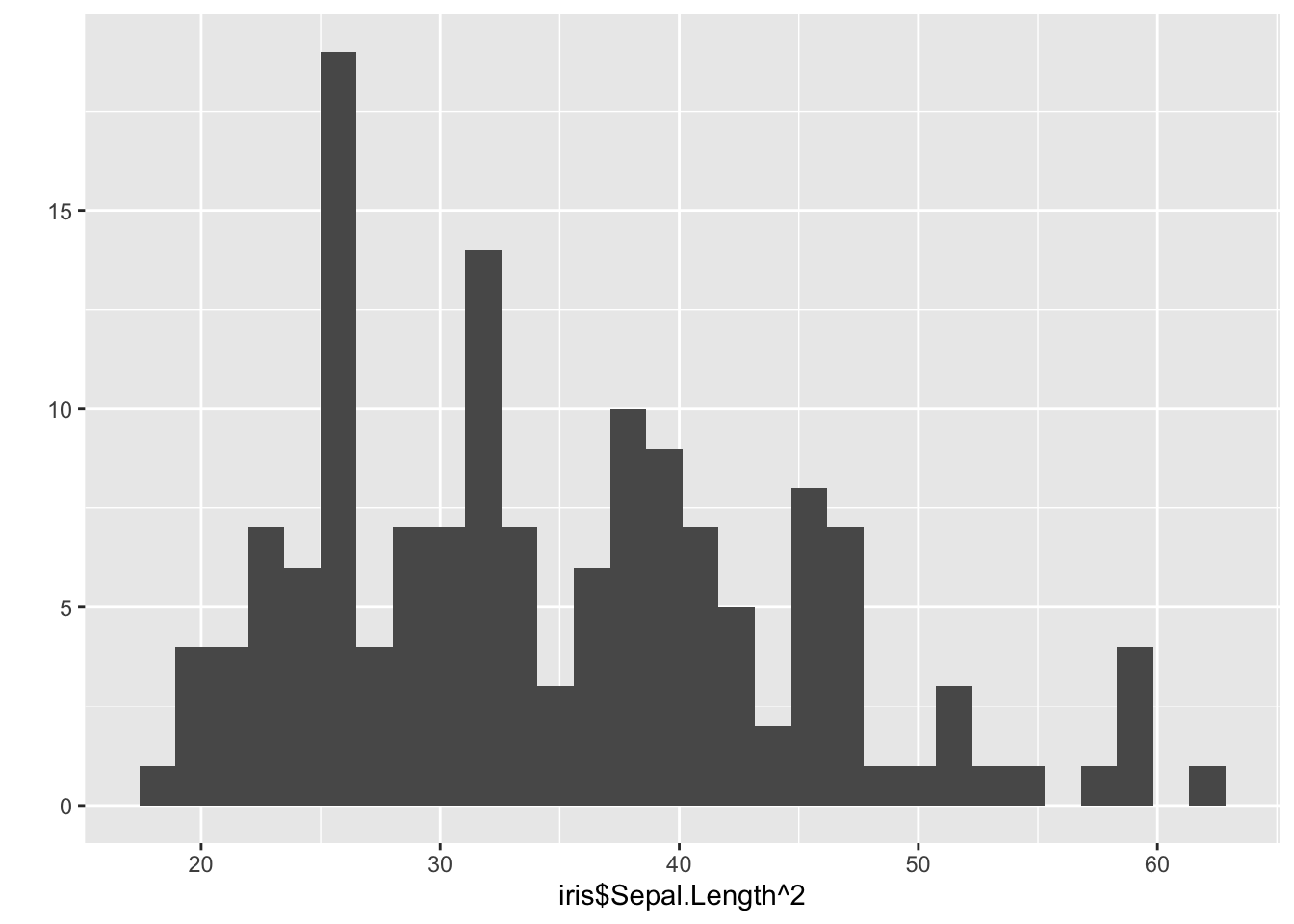 qplot(iris$Sepal.Length^2)## `stat_bin()` using `bins = 30`. Pick better value with `binwidth`.