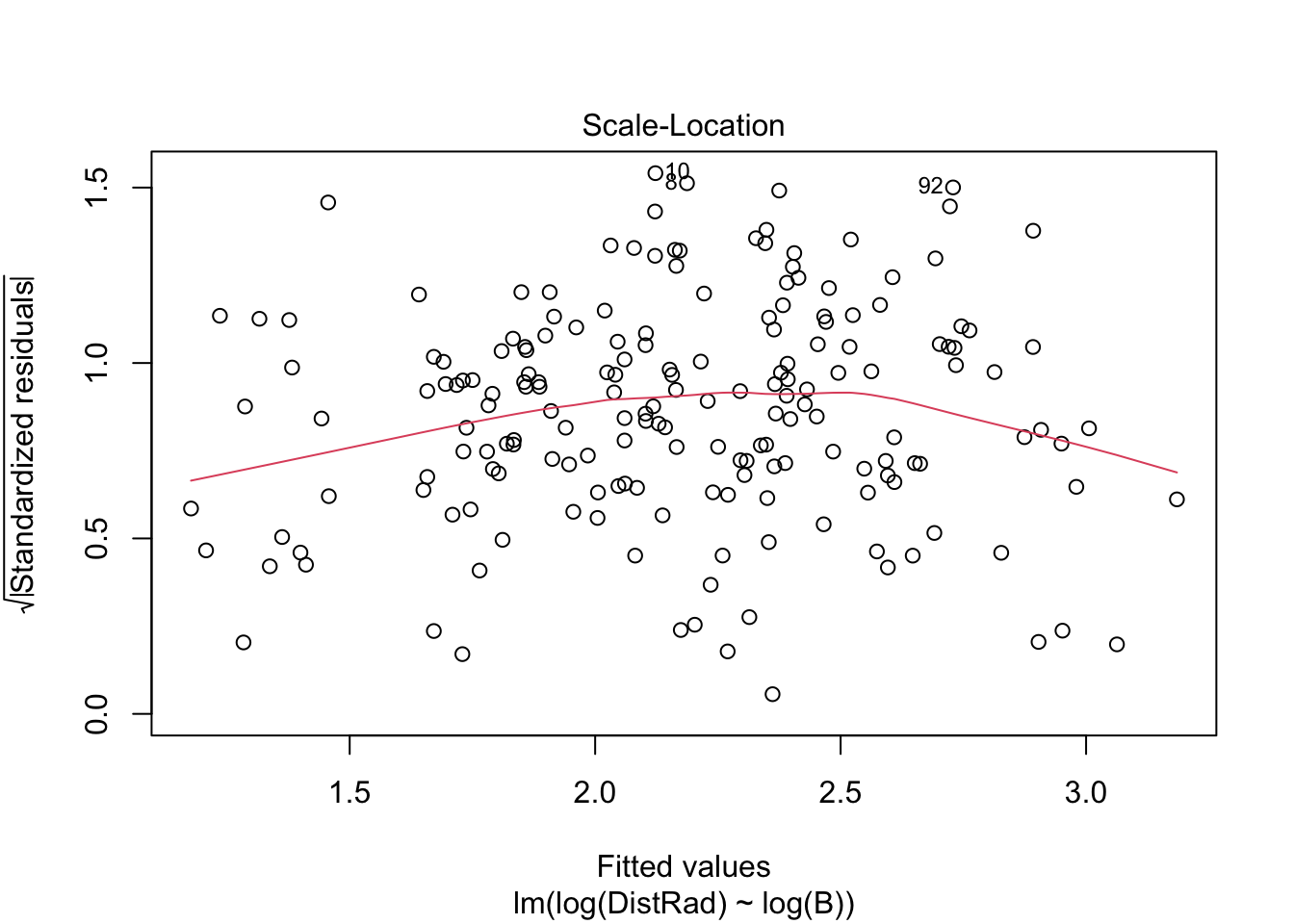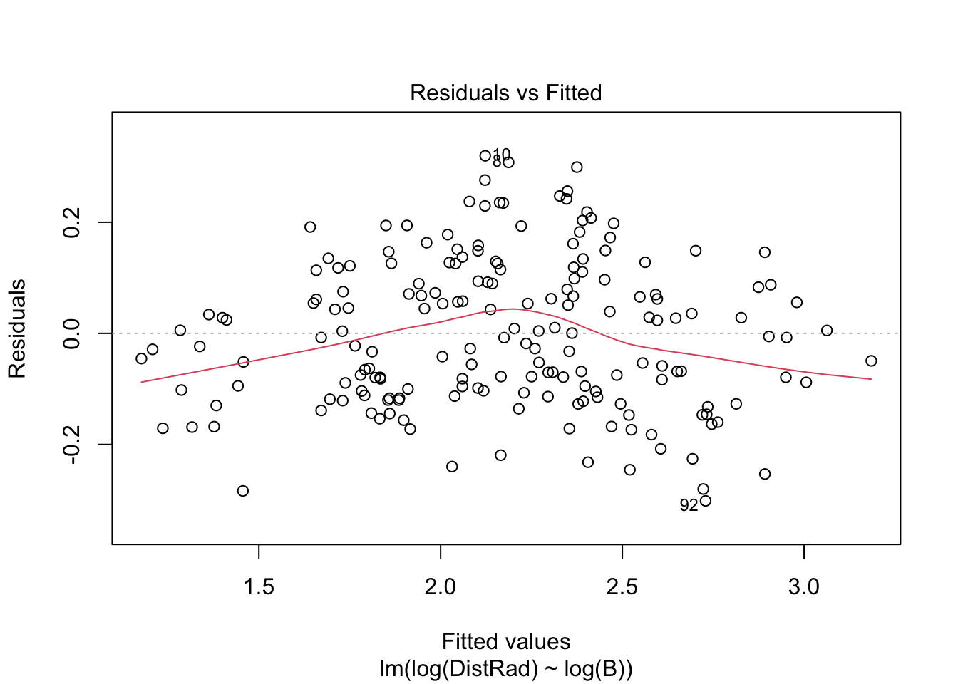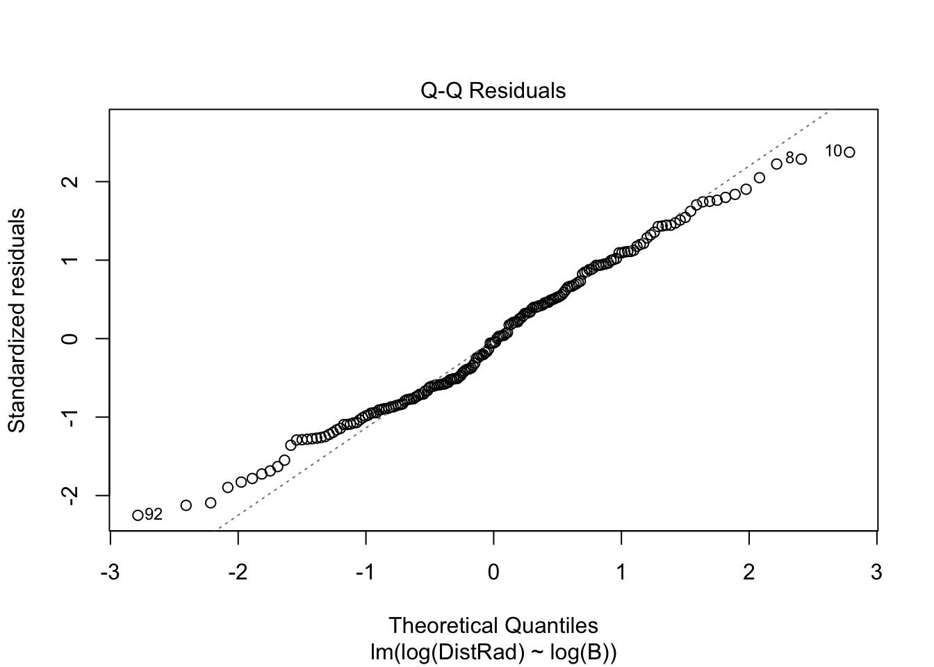 RMA_model <- lmodel2(log(DistRad)~log(B), data=astrag)## RMA was not requested: it will not be computed.## No permutation test will be performedRMA_model##