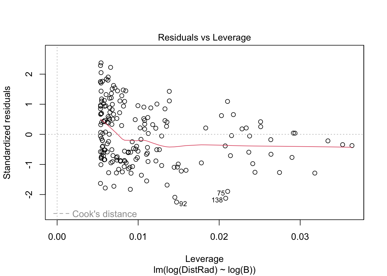 ## lm(formula = log(DistRad) ~ log(B), data = astrag)