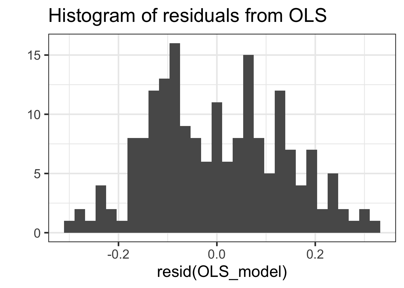 qplot(resid(OLS_model), main="Histogram of residuals from OLS") + theme_bw(20)## Warning: `qplot()` was deprecated in ggplot2 3.4.0.